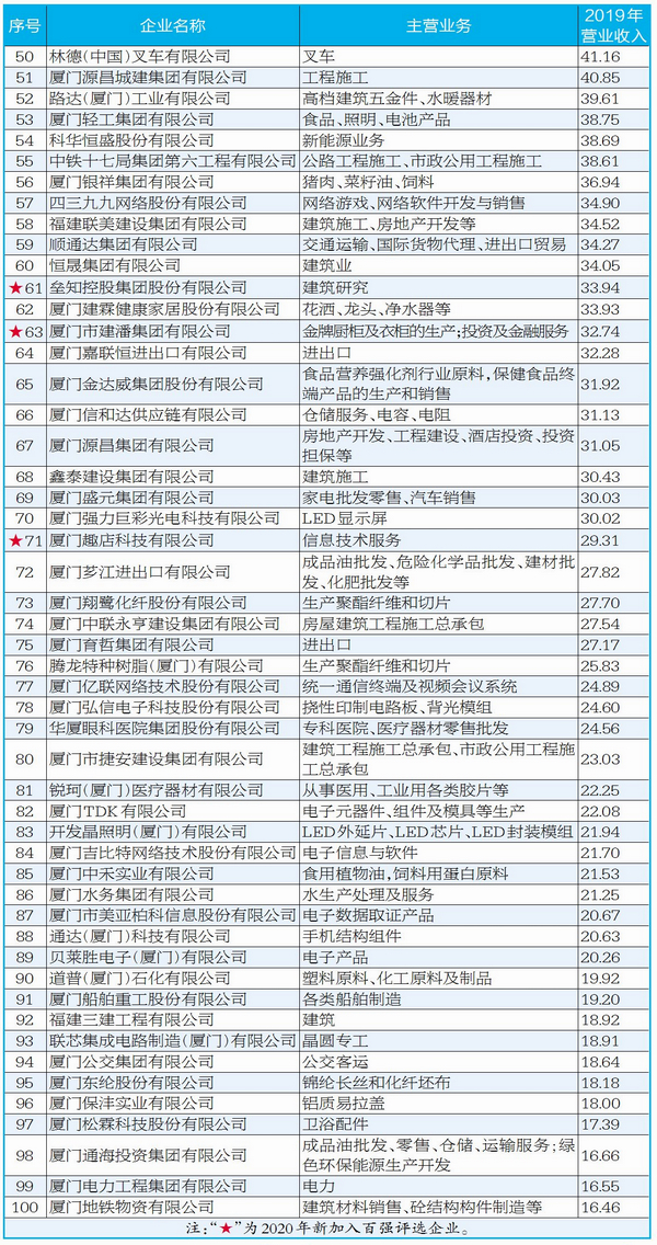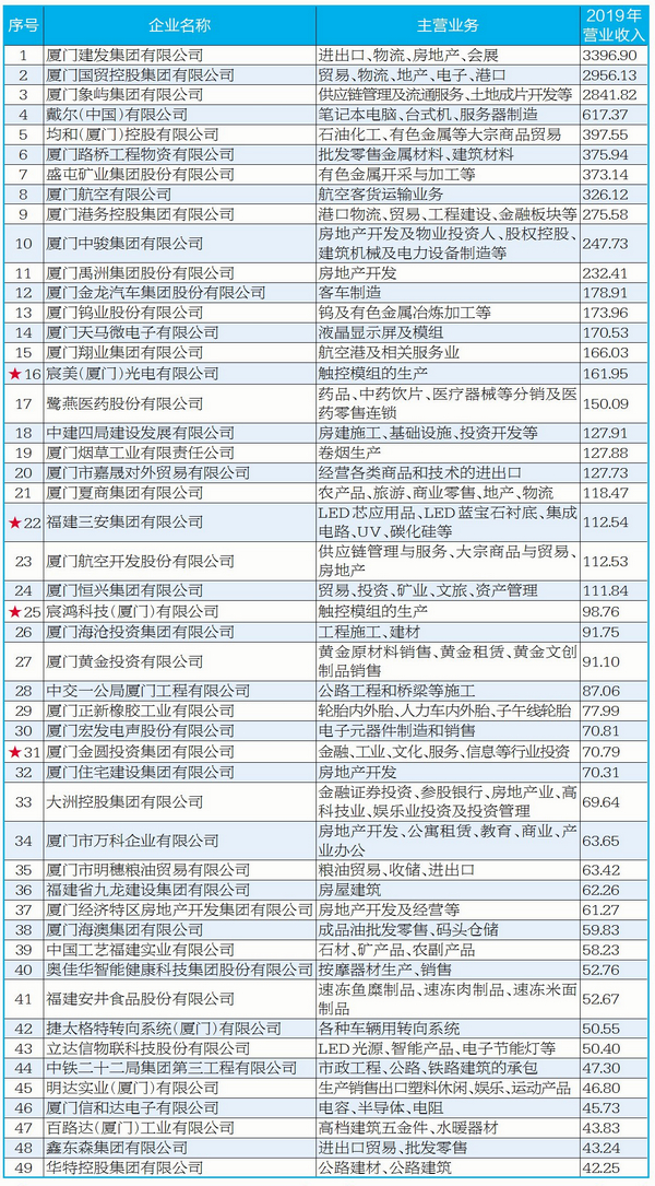 “2020厦门企业100强”完整榜单