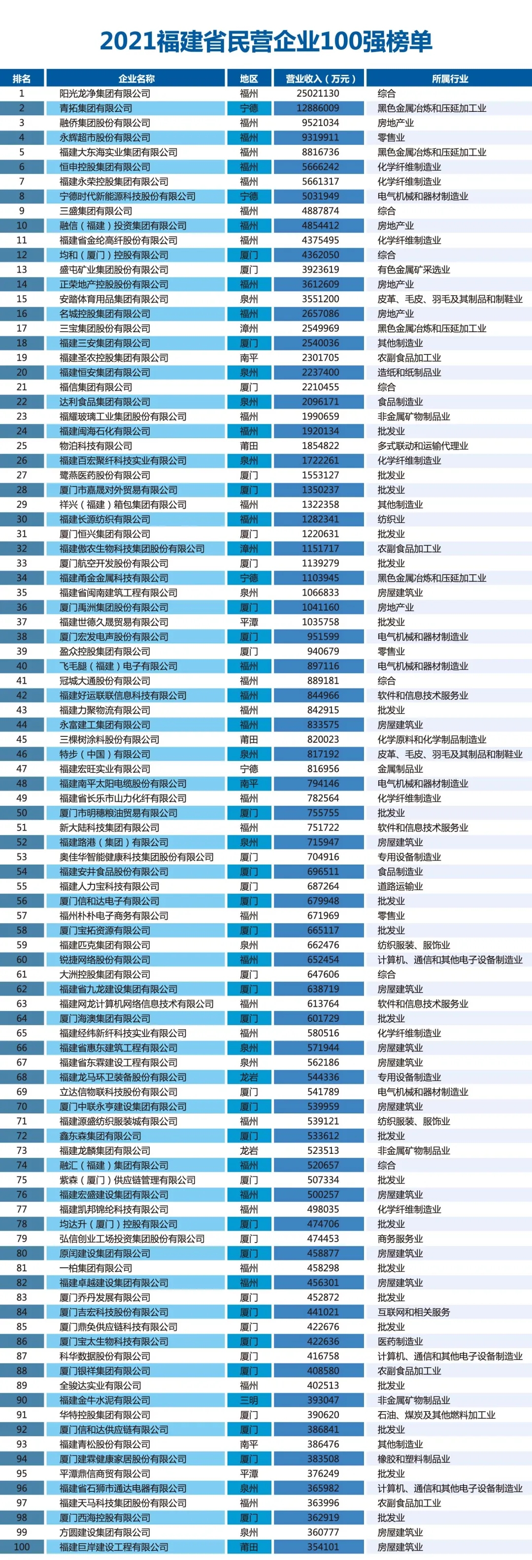 会上,省委统战部副部长、省工商联党组书记李家荣代表省工商联宣布了“2021福建省民营企业100强”“2021福建省立异型民营企业100强”“2021福建省民营企业制造业50强”榜单  。“2021福建省民营企业100强”中,抖圈官网位列第31位,厦门宝拓资源有限公司位列第58位  。